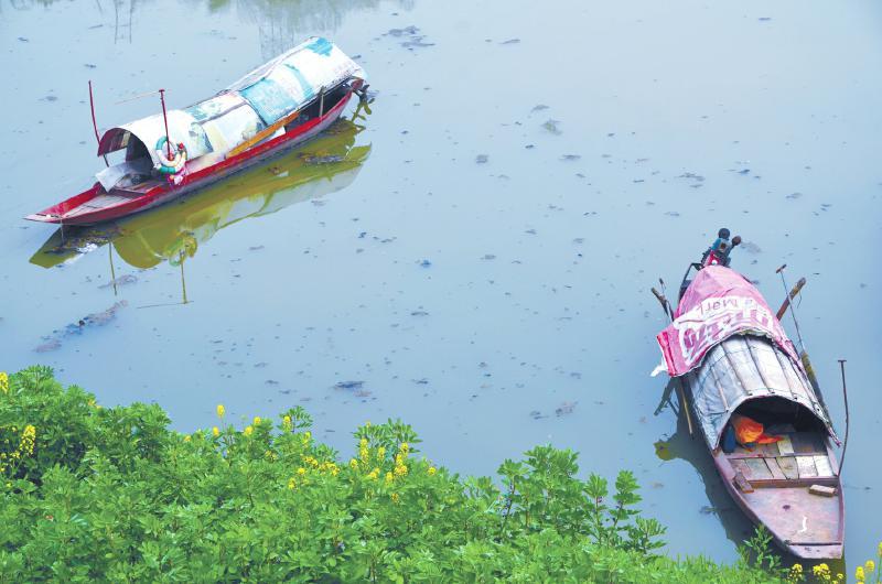 在谭大姐的指引下记者发现,公路边约120米宽的洲河,一半呈青色,一半呈乳白色,河面上漂浮着一团一团的黑色物体,旁边还停泊着几艘小渔舟。