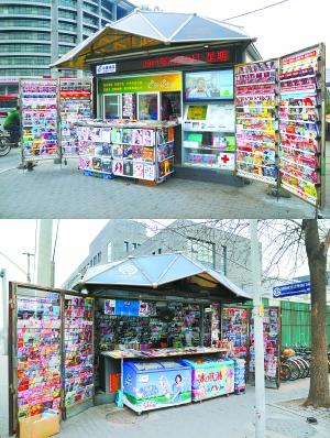 近日,一批新式智能报刊亭出现在北京街头,为市民提供新闻视频、自助缴费、商品自提等服务。在北京大学东门外,马路对面分别是新式智能报刊亭(左图)和旧式报刊亭(下图)。