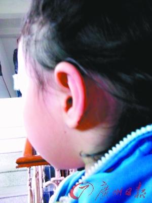 欢欢今年6岁,在番禺新英才中英文学校读一年级。据她反映,前天下午上体育课的时候,陈老师进入教室之后叫了一声“上课”,可能因为声音比较小,她和其他4名同学没有起立致敬。“老师挨个揪我们几个人的耳朵,其他的同学耳朵都没有流血,就我的耳朵流血了。”欢欢说,被揪了耳朵后感觉很疼。