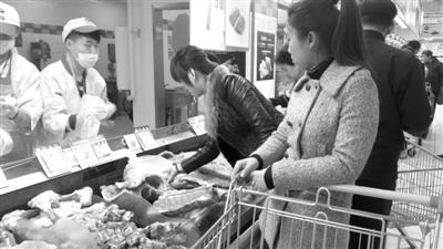 2013年全年,我国猪肉进口量58.4万吨,同比增加11.7%,进口增速过快也从一定程度上影响了猪肉价格。业内人士分析,猪价下降与生猪供应量偏多和市场销量减少有关。去年下半年,生猪价格持续回升,养殖户普遍看好年末价格有可能上涨,积极补栏,造成年末集中出栏,供应量大幅提高。另一方面,猪肉集中采购量大幅下降,餐饮、酒店等行业需求不旺,直接影响了猪肉消费。屠宰加工企业也在下调生猪收购价,使生猪价格下滑。而零售量也随着市民饮食习惯和消费方式的转变有所减少。(记者 梁庚 文/摄)