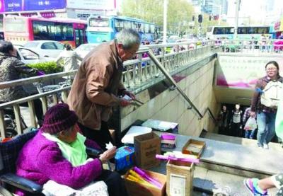 早晨10点钟左右,因为瘫痪而变得特别爱出门的刘永珍,开始嘟囔着要出摊。这时候,绍伏周就会背着小篓子,推妻子来到地铁口。