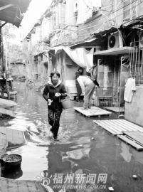记者看到,昨天中午虽然天气晴朗,不少居民穿着雨鞋,蹚水出门。一名居民告诉记者,有一对老夫妻,依伯晚上上厕所因地上全是水,不小心摔倒,依姆去扶他也摔倒,两人现在还躺在床上不能下地。