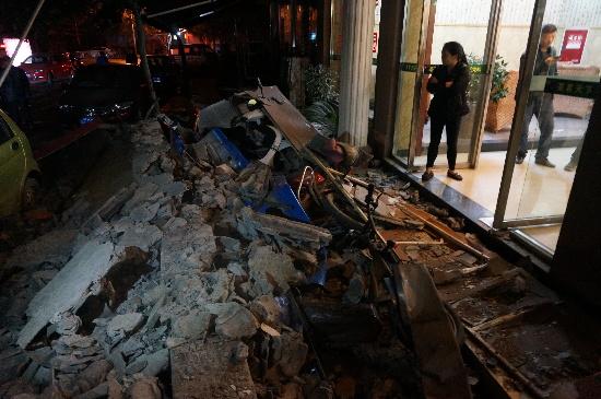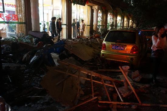 四川在线眉山频道记者赶到现场时看到,在城区高灯北街一家名为“茶茗天下”的茶楼门口已经堆满了废墟,一直蔓延近30米,停在路边的轿车均被滚落的钢筋砖头不同程度的砸损,更有数十辆摩托车、电瓶车被埋在了废墟下面。