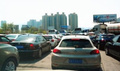天水路高速出入口车流量极大,堵车现象明显。记者杨志彬摄