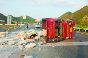 4月6日晚,一辆满载石块的中型自卸货车,在沪昆高速公路黄果树收费站匝道上高速的地方(贵阳往昆明方向),遭到小车“甩盘子”发生侧翻,石块滚落致交通半幅通行,3小时才恢复正常。