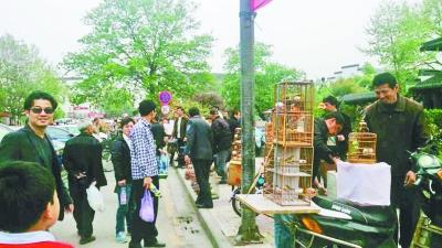 从本月起,夫子庙花鸟市场暂停禽鸟买卖,但记者昨天在长白街淮清桥附近探访发现,花鸟市场内的禽鸟交易虽然暂停,市场外的“黑市”却生意红火(如图,本报记者 张源源摄)。由于“黑市”地跨两个街道,摊主与两个街道的城管打起了你退我进、你进我退的“游击战”。