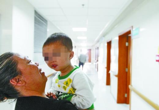 昨天,重医附属儿童医院血液科监护室11床,两岁半男童瑞瑞正哭着找爷爷,一旁的婆婆黄代莲不停安慰:“爷爷等下就来,不哭了。”仔细看,瑞瑞的脑袋上有一个大包,右眼也肿胀得无法睁开。