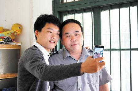 居住在学校宿舍六区的男生手举相机与保安“莫言大叔”合影。李一凡 摄