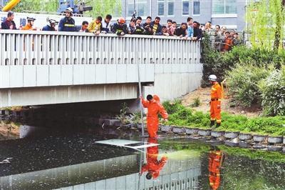 下午5点左右,消防人员来到现场,在测试完水深后,消防人员发现由于水深,车身完全浸在水里,他们无法将打捞用的绳索绑在车上。经过一个多小时的等待,在和相关部门沟通后,河流的下游水闸开始放水,十几分钟后,北青报记者看到,随着水慢慢变浅,车身也一点一点地露出来。
