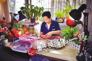 ■家中的工作台上,谢忠贵专心致志地制作一条红锦鲤标本。