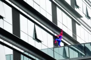 昨天下午,几张“蜘蛛侠攀爬南京百米地标”的惊险照片,在网上蹿红。一位男青年,身穿蜘蛛侠的红蓝紧身衣,面对一幢高层建筑的蓝色玻璃幕墙,竟然徒手攀爬到高处,并且摆出吐丝、贴壁等各种造型,萌翻了网友。