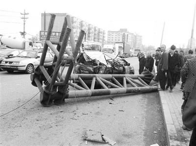 吊车刮倒限高杆 砸中轿车致车内一人受伤(图)