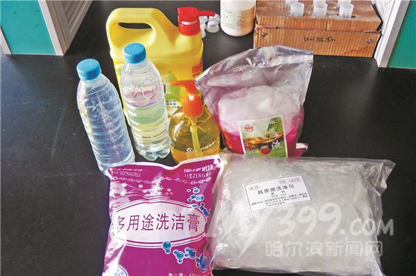 记者购买了3类高浓缩清洁用品,其中洗洁精和洗手液包装袋里有固体白色粉末和稀释剂各一包,价格在5元至15元,按照说明加水可兑出合两三毛钱一斤的液体。随后,记者将样本及在道里、道外和松北区的部分餐厅、超市取得的洗手液、洗洁精样本一起送到东北林业大学进行实验。