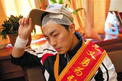 金汉在表彰会上,其头部的伤口仍未痊愈。新京报记者 王贵彬 摄