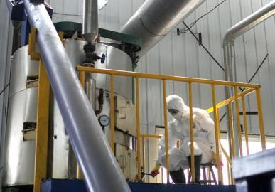 通过处理炉持续145度高温和高压,4小时后死猪不见了,炼出的油脂沿着密封管道,冷却后进入了室外的油料储存罐中。而剩下的残渣则通过除臭、发酵、分装等程序,最后变成像土壤一样松软的有机肥料。据介绍:一吨病死生猪(约为20头),可以生产出15公斤的工业油脂,以及285公斤的有机肥。