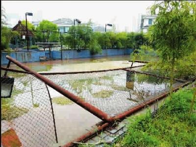 小区居民告诉记者,当年,为了取得外观上的新颖感,开发商将这个网球场设置在一个独立岛上,作为下沉式设计,由一条小路与外界联通。这样的设计曾赢得不少购房者的倾心,成为楼盘的一大卖点。然而,10年过去了,网球场的弊病暴露无遗。下沉式设计对地下防渗漏装置的要求极高,如今防水层彻底损坏,于是,好好的一块场地就沦为了污水池。每逢下大雨,里面的积水可以没过小腿。