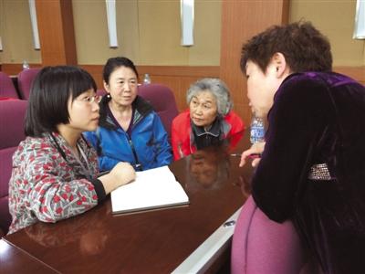昨日,听报告的居民会后向市交通委委员容军反映,家门口原来的公交车改线取消了两站,给周边老百姓带来不便。容军让工作人员(左一)现场对居民反映的问题进行记录,答应会带回去交有关部门处理。 新京报记者 郭超 摄