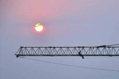 昨天下午,男子仍坐在塔吊吊臂上。京华时报记者赵思衡摄