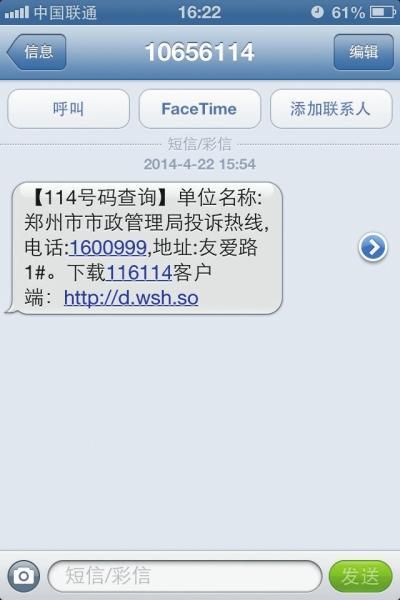 记者按照肖女士所说,拨打了114查号台,查询郑州市市政立刻办的热线电话,114的话务员在查询后给了一个1600999的电话号码(如图),在记者随后收到的短信上显示,该号码是“郑州市市政管理局投诉热线”。记者随即拨打过去,电话接通后,首先播放了一段语音:“这里是160公益热线,郑州联通用户拨打按市话收费”,随后,另一段语音响起:“这里是市政管理局立刻办热线……”语音未落,随即第三段语音响起:“对不起,您拨打的电话号码是空号,请查询。”