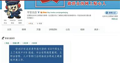 18点15分,北京市公安局官方微博@平安北京发表情况通报,针对27日《北京青年报》刊登的《32个陌生人上了我家户口》的报道,市公安局高度重视,立即由督察、人口等部门会同海淀分局成立调查组开展工作。
