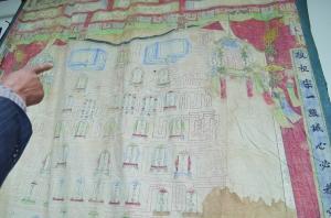 昨天上午,金陵晚报记者在在里自然村村民芮根寿家见到了他们芮姓家族代代相传的宗旨,芮根寿老人从楼上拿下来一个口袋,并从口袋里拿出折叠好几层的古布,由于布的长宽较大,老人无法展示开。今年64岁的芮根寿老人告诉金陵晚报记者,这块古布就是他们代代相传的家族宗旨。宗旨长有2米多,宽有1米多,宗旨两边写有“教子孙两条善路日耕日读,敬祖宗一点诚心必恭必虔”,以及“福禄寿禧”等字样,宗旨下端绣有清代时期人们穿官衣戴官帽的景象。
