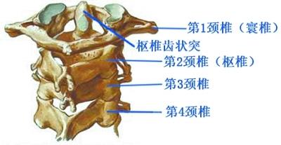 人的第一颈椎叫寰椎,第二颈椎叫枢椎,是两节环形颈椎,寰椎连接颅骨,枢椎的前部环上有个齿状突,上面附着韧带与寰椎相连(如图)。如果想象在寰椎上的圆环前部截取一段弧形并将它看作一张弓,这张弓的弦就是坚强的横韧带,再加另外几根细小而坚强的韧带,构成关节,将这两个颈椎连在一起。