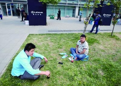 ▲展馆外面,逛累了的观众在中心花园的绿化带中席地而坐,一边休息一边喝饮料 摄/法制晚报记者 林晖