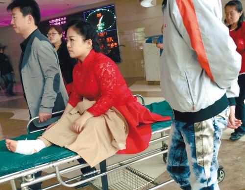 昨天下午2时,记者来到沈阳医学院奉天医院手外一科。此时,刘女士的脚部的伤口已经处置完毕。经医生诊察,脚部受伤的情况并不十分严重,未伤及主要血管,所以无须住院治疗。医生将刘女士脚部的玻璃碎片取出并做消毒后,做了包扎处理。随后,刘女士被家人用担架抬到一楼急诊室做最后处置。在急诊室,仍然身穿红色结婚礼服的刘女士正坐在担架上。脚部缠着厚厚的绷带,在脚的下面,一大摊血迹仍未干。