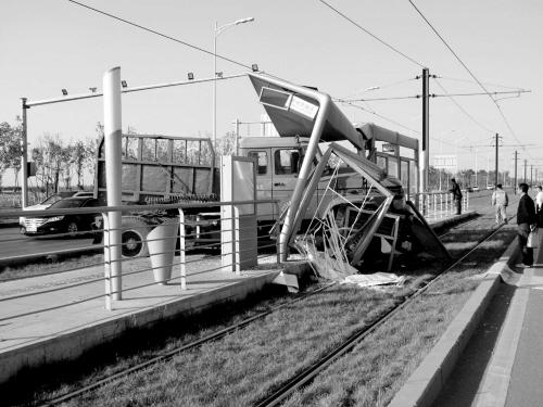 大货刹车失灵撞“瘫”沈阳一轻轨 候车亭受损严重