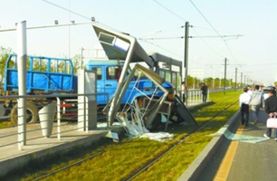大挂车行驶途中刹车失灵,冲上有轨电车站台,不仅撞毁了站台的候车亭,还导致有轨电车5号线停运数小时。