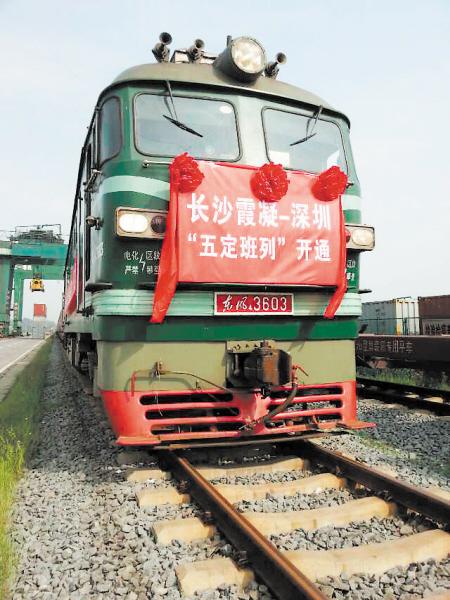 一条铁路线北起长沙,南抵深圳,湖南的出口产品在长沙通过一站式服务,然后由“五定班列”快速运抵深圳,再通过那里密集的国际集装箱班轮航线源源不断走向世界各地……昨日上午,一阵嘹亮的火车汽笛声在长沙霞凝铁路口岸响起,满载着40标箱出口货物的81231次货运列车缓缓开出驶向深圳。这标志着长沙霞凝铁路口岸于昨日通过验收。同时,长沙霞凝—深圳“五定班列”也正式开通。副省长何报翔,市委常委、副市长张迎春,副市长何寄华等出席验收授牌仪式。