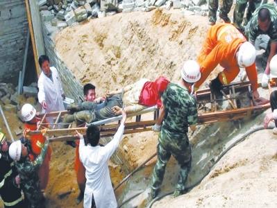 中午12时许,记者赶到事故现场。在建房屋工地位于两座楼房之间,是个将近6米深的地下室,面积不大。已建立起来的4堵砖墙,一面整体坍塌,将5名施工人员埋住。消防官兵搬来6米多高的梯子,下到地下室营救。