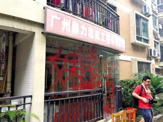 昨日早上8时左右,一阵剧烈的玻璃破碎声音把冠庭园小区21号1楼的居民赖先生吵醒。他出来一看,眼前一幕吓了他一跳,只见103号一间公司的玻璃被砸碎,门前被人用红漆涂满“小三”、“不要脸”等字眼,门前站着一男一女,两人站在门口看了一会,什么也没说便离开了。