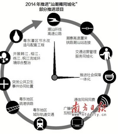 围绕省委书记胡春华提出的“建设汕潮揭城市群、打造粤东经济增长极”的目标要求,三市一致决议,2014年将着力在推进交通一体化、产业合作发展、公共服务同城化、社会秩序整治、环境保护和体制机制创新上下工夫,在做好续建12个项目的基础上,重点推进21个项目,共推行33个项目,打造起汕潮揭“1小时生活圈”。