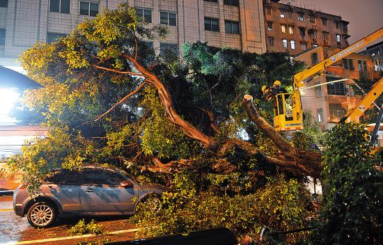 昨晚7时许,记者到达现场,只见一辆蓝色沃尔沃轿车的前半部分被一棵倒下的大榕树覆盖,树干直径约半米,根部翘起,裸露在外。绿化作业人员正分段锯开倒下的树干,电车公司的作业人员已在高处抢修线路,事故现场占据了南北双向三条车道。