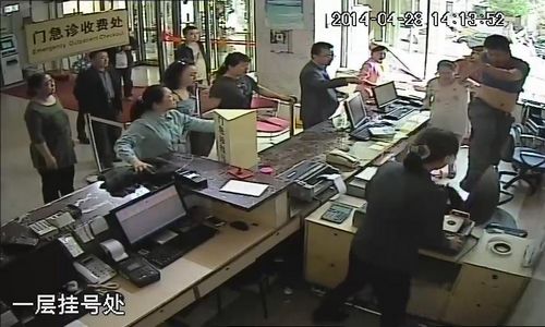 4月28日14时13分,山西博爱医院大厅内,一名男子冲进医护人员工作区,用手中的文件袋朝护士脸上扇去,护士起身反抗,两人开始扭打。就在护士蹲下身时,该男子又对护士连踢两脚,随后在众人帮助下王某离开工作区。