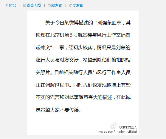 以下是微博全文:关于今日某微博描述的“刘强东回京,其助理在北京机场3号航站楼与风行工作室记者起冲突”一事,经初步核实,情况只是刘总的随行人员与对方交涉,希望删除他们偷拍的相关照片。目前相关随行人员与风行工作室人员正在调解过程中。具体声明请见长微博。