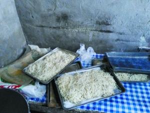 5月7日上午,记者随城关区食药监局执法人员来到位于盐场路的上川村。在一处院子的边角上,执法人员看到一扇破旧的木门紧紧锁起,执法人员在先期探查之后,强行打开大门,沿着窄窄的便道,地面上流淌着散发着阵阵恶臭的污水,进入最里面的一间房,发现里面摆放着和面机、蒸饭柜等,在墙角的一张案板上,几个托盘内盛放着已经加工好的酿皮等,在一个塑料大盆内,放着一块块制作好的面筋,屋内苍蝇乱飞,十分肮脏。
