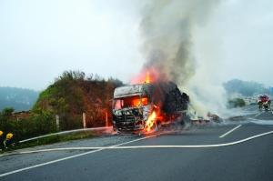 贵都高速贵定境内货车轮胎爆燃 百万烟草成灰烬