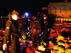 据民警介绍,经初步了解,未摔坏的西瓜还有近三十吨,估计价值在10余万元。(杨斌 本报记者 张仁东)