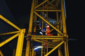 见救援时机成熟,两名消防员迅速带上防护装备爬上塔吊,给两女子系好安全带后,21时许成功将两人送至地面。(陈宣 本报记者 高松)