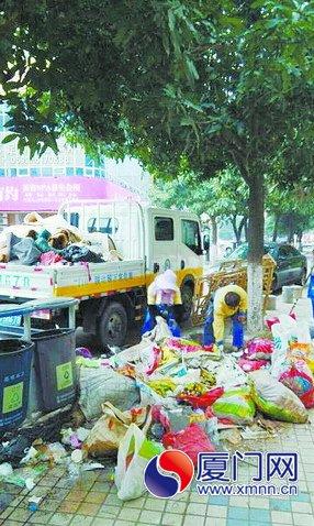 一夜之间从哪冒出这么多垃圾?环卫工人小谢说,这里地处厦禾路主干道背后,四周都是居民楼,店铺也多。乱丢垃圾的人似乎已摸清他们的上班规律,跟打游击一样,专挑他们下班时间丢垃圾。