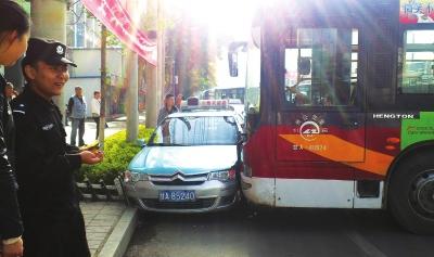 5月11日上午9时2分,在西关十字公交枢纽站77路车站前,一辆停着的自编号为4153号的77路车,由于刹车松动自行滑行,撞上路边停放着的一辆甘A·85240号出租车,出租车左前门被撞凹进去,幸好没有造成人员受伤。