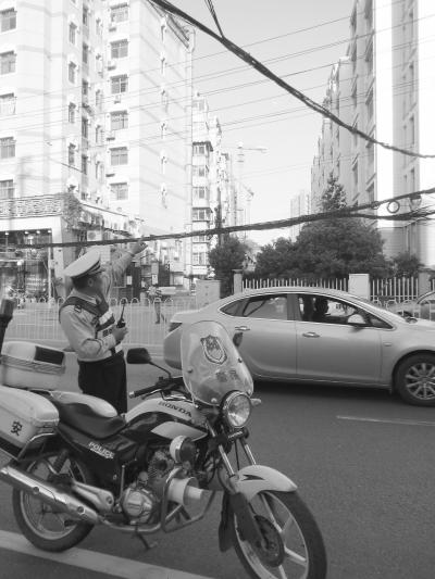 昨日上午8时09分,网友“彩霞映楚天”发布的微博图片记录了一名交警托举线缆的情景。记者与当事人——武昌区交通大队四中队交警王丰取得联系。