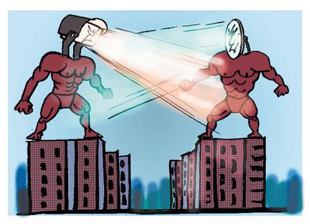 江苏省无锡宜兴市中星湖滨城有居民安装了7盏大射灯,每当夜幕降临时,这些射灯就会亮起,一亮就是一整夜。安装射灯的居民说,射灯的安装就是为了迫使对面把“照妖镜”拆掉,他原本也不想用这种极端的方式,但一段时间协商无效后,他只能出此下策,希望对方忍受不了强光的照射,能主动把“照妖镜”给拆了。(5月13日《现代快报》)