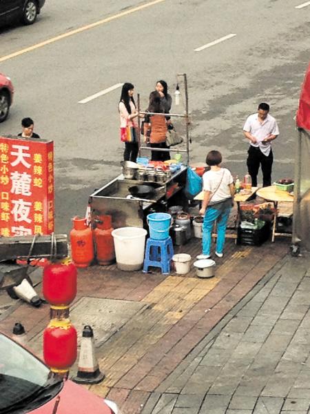 摊贩 占道 天马路,一家夜宵店摆在盲道上。