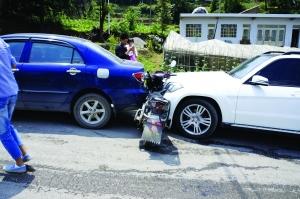 摩托车被夹在两辆轿车中 夹心车祸骑手跳车逃生