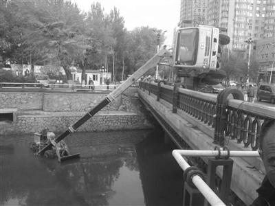 13日16时许,在哈市南岗区大成街儿童公园门前,一辆吊车在使用吊臂将一辆铲车吊入马家沟内准备进行清淤作业时,由于起重机失去平衡导致吊车车体发生侧翻,所幸没有造成人员受伤。(记者 肖劲彪/文 微记者 温欣/摄)