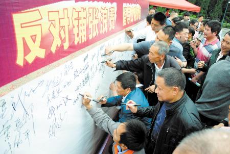 昨日上午,在胡耀邦故居外的广场,浏阳市中和镇上千名村民聚集在一起,他们中有白发老人也有家庭主妇,村民们排着队在一张标有“反对铺张浪费,倡导文明办酒”题头的巨大白板上签下自己的名字。