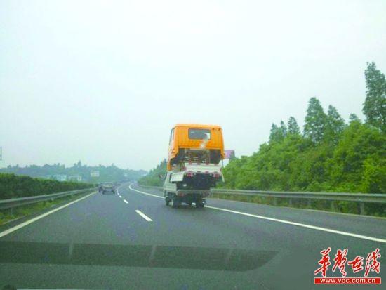 微博配发的图片显示一辆白色小卡车行驶在高速行车道上,载着另一辆同型号的白色小卡车,而这辆小卡车上还搭着一台挂车的驾驶室。